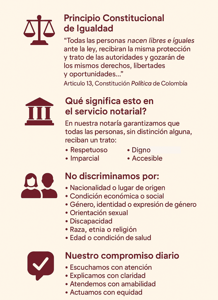 - La Notaría, facilita el acceso de perros guía, sillas de ruedas, bastones y demás elementos o ayudas necesarias, para las personas que presenten dificultad o limitación de su movilidad y desplazamiento. Para ello cuenta con fácil ingreso de personas con algún tipo de movilidad reducida y de personas en silla de ruedas.